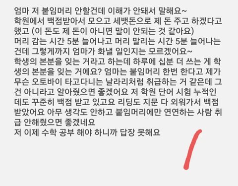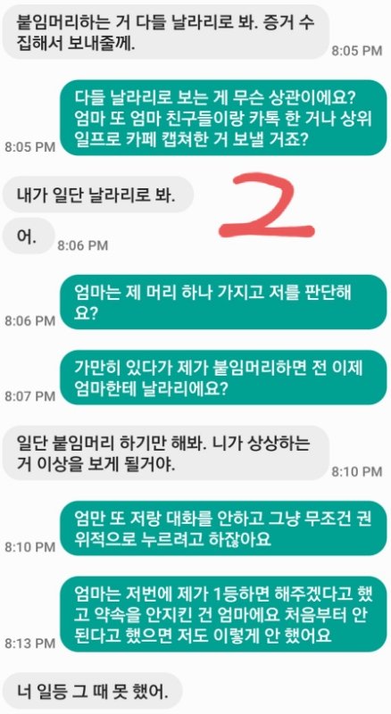 약속을 어긴 엄마 앞에서 짜증한번 안내면서 붙임머리 안할거고 할거 다 하고 집에 들어간다는 니가 훨씬 이성적이다.. 나는 성인인데, 너희 엄마가 좀 성격이 강하신 것 같아..