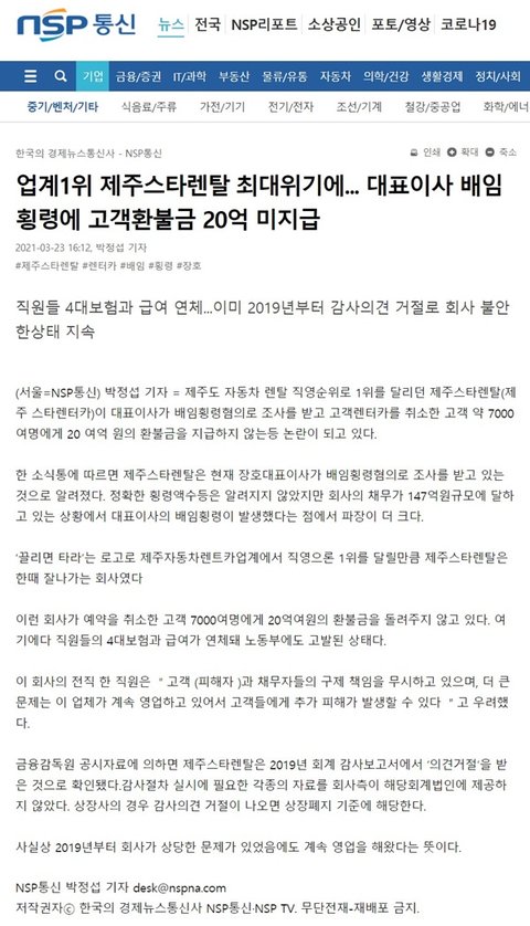 제주 스타렌터카는 도내 1위 렌터카라고 광고를 하면서안으로는 직원 월급 약 4억여 원과 고객의 취소 환불금 약 20억 여 원을 체납 중입니다.그리고 대표이사는 배임 횡령 혐의로 현재 경찰 수사를 받고 있으며,회사 자산인 자동차와 차고지는 압류 중.