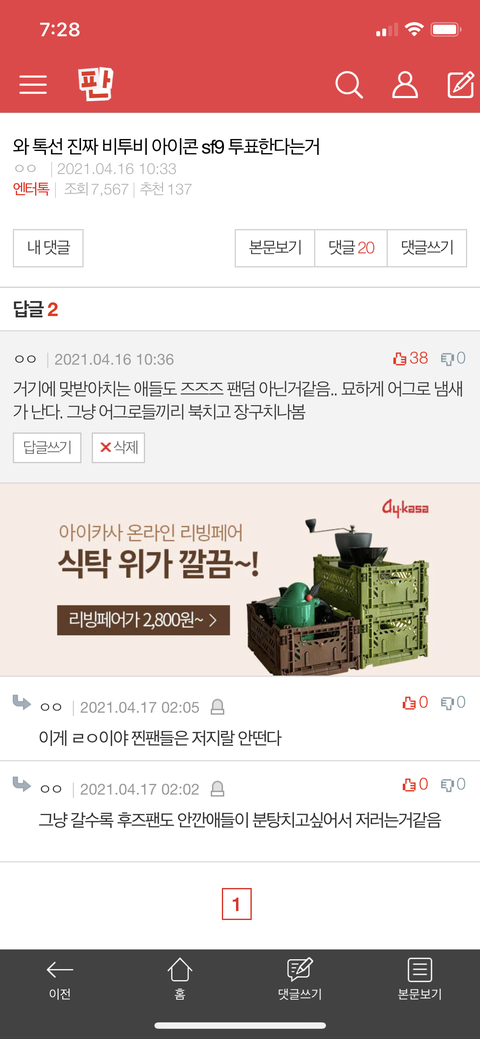 상처 받지마 여긴 진짜 원래 말같지 않은 어그로글 가져와서 거기 같이 참가하는 그룹 팬인척 하면서 까고, 이간질 지리는 곳이야 상처 받기엔 다들 킹덤 보기에 바쁘잖아 스밍도 해야되고 지금 투표도 해야 되는데