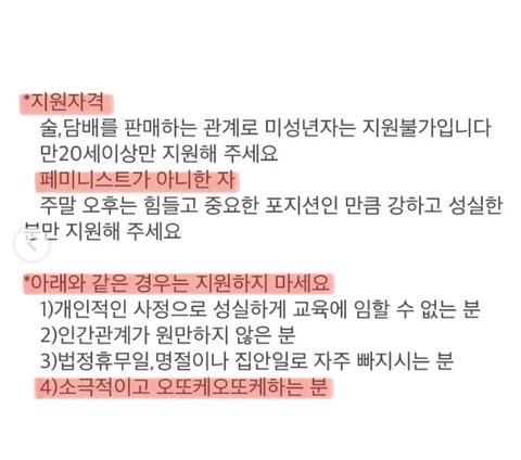 gs 알바구인공고 조건에 페미니스트와 소극적이어서 오또케오또케하는 사람은 지원 거부한다는 글이 올라왔어