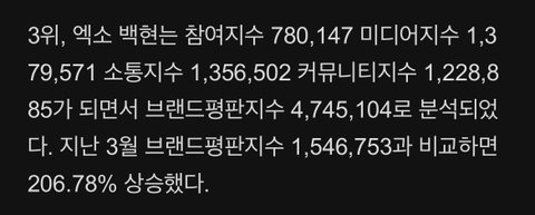 백현이 브랜드평판 지수 3월에 비해 200퍼 넘게 상승이래