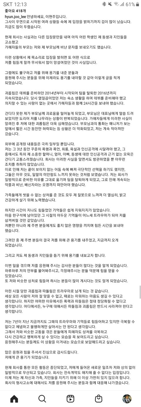 전 에이프릴 이현주 인스타 입장문 올라옴