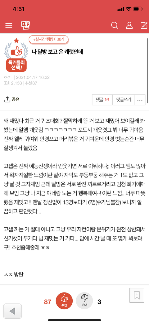 럿드리 많이 어이털렸구나.. 나도.. 댓이 많아졌어 저기 ㄱㄷ 쟤 말 ㅈㄴ 멶도 같이함