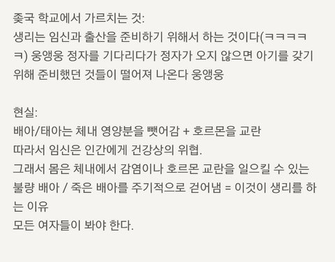 생리가 정자를 받기 위해서만 하는게 아니야..; 솔직히 나도 옛날에는 이런건줄로 알고 있었는데 한국 성교육 심각하다