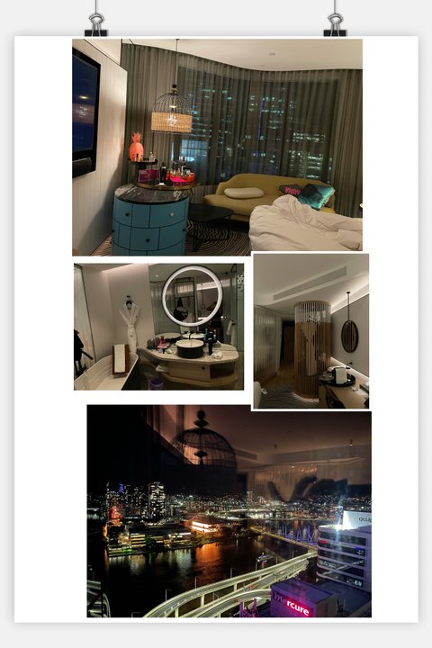 퀸 배드 두 개 19층에서 강변의 야경, 일출과 일몰을 볼 수 있어서 좋았고 전체적으로 건물이 모던하고 펑키해서 예전에 갔던 오성급 호텔보다 더 마음에 들었어요. 위치도 시내라서 편하고요. 브리스번은 한국인들이 많이 정착해서 시내 거리 표지판도 한글로 표기됐고 한식당도 여러 곳이 있었어요.