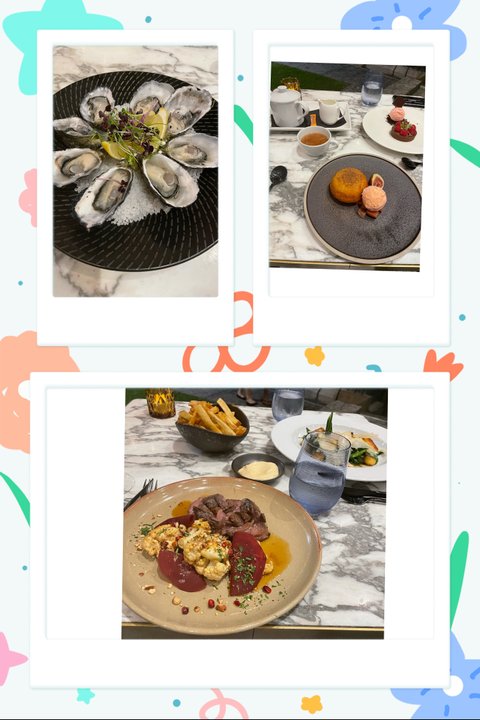 마지막 저녁이라고 근사한 곳 예약했는데 딸없이 아들과 조촐하게 야외에서 식사를 했어요. 야경이 예뻐서 커플들이 주위에 있었지만 우리 모자는 대학 이야기 등등 건설적인 주제를 논하며 온튜레로 생굴 ( 생굴 한 개 5달라) 먹고 저는 양고기 아들은 뇨키 양이 적어서 감자칲 추가하고 디저트는 두 개 나눠 먹었어요. 레드 와인은 딱 한 잔만 마셨습니다. 배탈이 더 심해지면 안 되니까요.