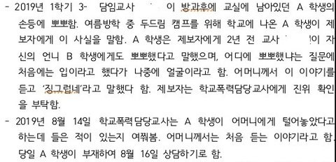 이 수사관은 제가 참고인이었던 첫 수사 단계에서 학교장에게 "이런 사람은 절대 용서할 수 없다."라고 하며 편파 수사로 일관을 하다 아이들의 말을 뒷받침할 수 있는 아무런 증거도 나오지 않은데다 거짓말탐지기 조사까지 제게 유리하게 나오니 고의로 이 기록을 빼버렸을 가능성이 큽니다.