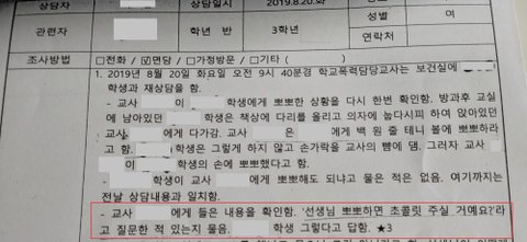 당시 저는 학교 폭력과 관련된 업무 담당이 아니었으므로 정확한 매뉴얼을 몰랐기 때문에 상사인 교감의 지시를 따를 수밖에 없었으며 정상적인 처리 대신 5회의 상담교육을 이수하는 것만으로 처분을 끝내게 되었습니다.