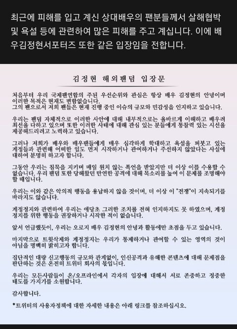 그러나 저희가 배우와 배우팬들에게 매우 심각하게 학대하고 욕설을 퍼붓고 있는 계정들과 관련해 어떠한 일도 먼저 시작하거나 관여하거나 주선하지 않았다는 사실에 대하여 분명히 하고자 합니다.