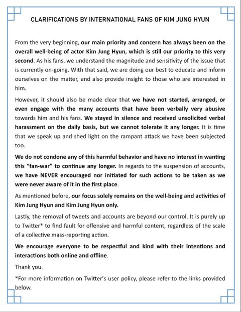 처음부터 우리 국제팬연합의 주된 우선순위와 관심은 항상 배우 김정현의 안녕이며 이러한 목적은 현재도 변함없습니다.