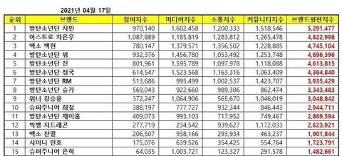 보이그룹은 1위 고정에 방탄 모든멤이 항상 높고