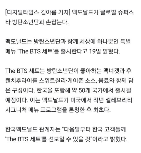 The BTS 세트는 방탄소년단이 좋아하는 맥너겟과 후렌치후라이를 스위트칠리·케이준 소스, 음료와 함께 담은 구성이다. 아 지금 당장 줘