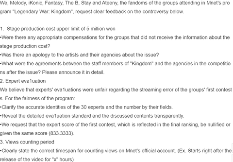 이메일 제목은 < Mnet ‘킹덤: 레전더리 워’ 논란에 대한 명확한 피드백을 요구합니다 > 로 통일 사진 첨부 / 인스타 디엠으로 사진 전송 / 해시는 하던대로!