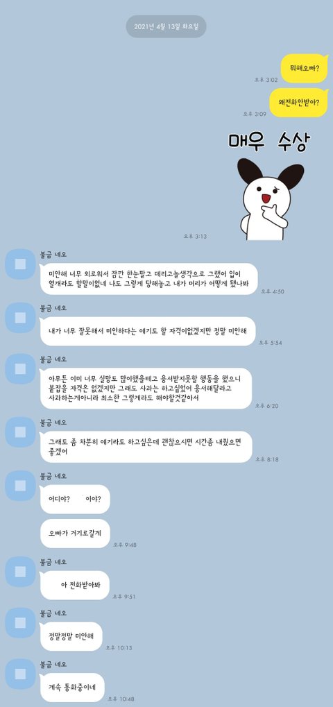 오빠 입원하고 일주일동안 저는 생리통때문에 집밖으론 나가지도 못하고 연락도 서로 아프니까잘 못했네요처음이랑 너무 달라진 그의 행동, 말투들이 보여도한편으론 '그래 사람이 처음같이 한결같을순없지..오빠도 지금 많이 힘들고 아프고 시기가안좋은데' 란 생각이 들면서도 '아무리그래도그렇지 너무 무심하네..' 생각이들었어요.