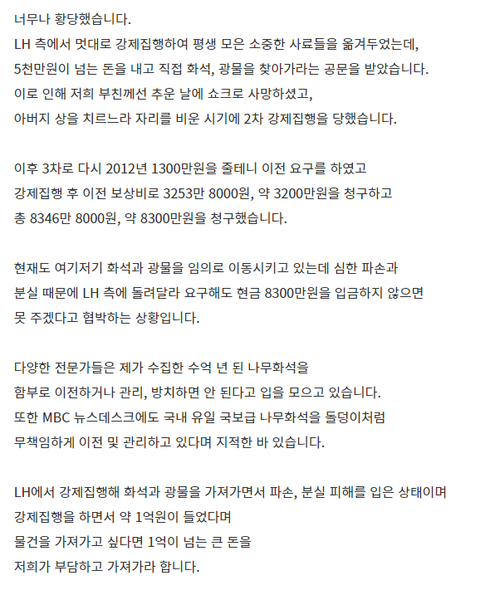 그러다 강제집행을 당할 당시 할아버지가 돌아가시게 되어서 아버지가 자리에 못계셧는데 그 틈을타 LH에서 감정평가사를 대려와 임의로 감정을 평가해 포장이사 없이 옮기다가 물건이 부서지고 분실 되었습니다