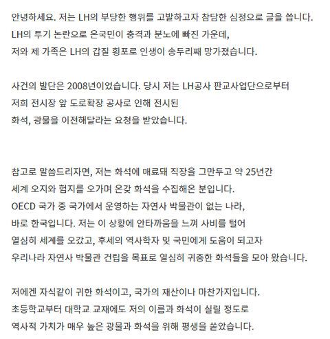 LH에서는 화석을 공터로 옮겨놓고 부서지고 망가지고 분실된 화석 광물을 찾아가고 싶으면 1억원을 청구하고 있습니다