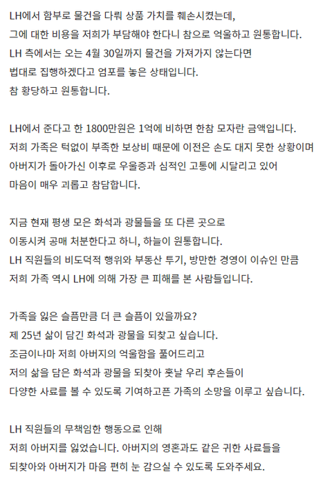 그러다 강제집행을 당할 당시 할아버지가 돌아가시게 되어서 아버지가 자리에 못계셧는데 그 틈을타 LH에서 감정평가사를 대려와 임의로 감정을 평가해 포장이사 없이 옮기다가 물건이 부서지고 분실 되었습니다