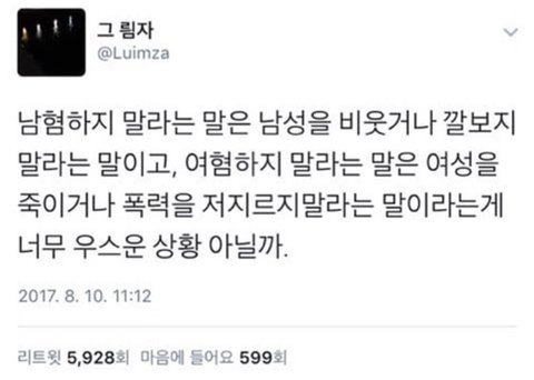 이 글도 꼴페미가 썼네하고 욕하려나 요즘 이렇게 힘든 상황(코로나,중국,인종차별)에서 우리나라 사람들끼리라도 똘똘뭉쳐서 살았으면 하는데 유튜브를 가나 네이버 댓글을 보나 항상 남녀갈등 댓글이 보여서 씁쓸하더라고 그래서 한탄하듯이 한 번 써봤어