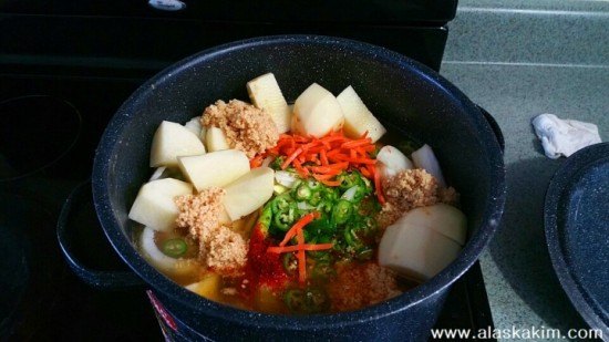그다음에 된장과 마늘과 고춧가루, 고추장, 양파, 당근, 감자, 배추, 고추 등을