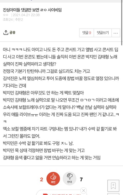 지민이는 창법좀 바꿨음 좋겠어... 무슨노래든 염소소리에 그 특유에 끝음처리... 그게 매력이라고 생각하는 아미도 잇겠찌만 그걸 부담스러운 아미들도 많아... 고음에 강박관념좀 버리면 더 괜찮을듯... 태형이야 애초에 보컬라인이 아니라 기대치가 없어서 그런가 그냥 삑사리만 안나게 연습하면 좋겠어...