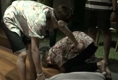 눈가리고 숨바꼭질하다가 진형한테 걸린 정구기