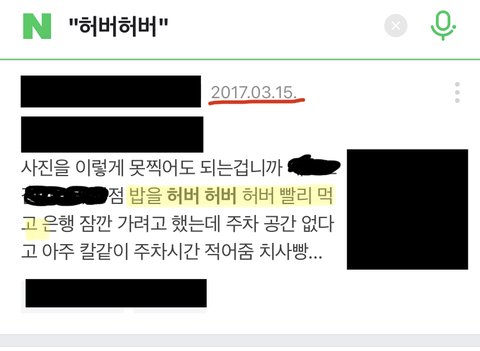 남자들이 허버허버가 남혐인 이유라며 주장하는 사진속 글의 게시 날짜보다 훨씬 이전인 2017년, 2015년에도 "급하게"를 뜻하는 의태어로 많이 써왔다는 걸 알 수 있음 (급하다는 뜻 외에도 전남 방언 허버지게: 굉장히를 활용한 말이라는 것도 알 수 있음)