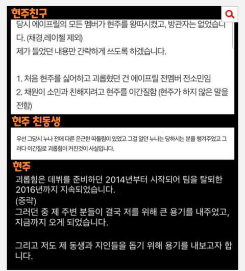 난 채원이 땜에 중립 만약에라도 오히려 채원이가 현주한테 배신당한거면 ㅈㄴ억울한 상황 맞잖아 ㅠㅠ 글에서도 억울함이 느껴지고 영상들 암만 찾아봐도 채원이랑 현주는 친해보여 2014년도 부터 가해자였다면 현주가 채원이한테 기대는 모습은 왜 많을까?? 채원이가 현주 챙기는 모습도 많고 말야