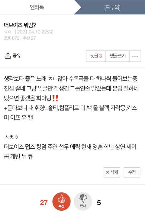 이때 이 글을 쓸때까지만 해도 그냥 생각보다 좋은 그룹이라고만 생각했던 나를 후회하는중..평생더비 하겠어