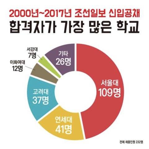 여기서 방송계 이대 학벌 운운하는거... 미안한데 방송쪽 업계 들어와봤어? 언론사에서 학벌 가장 많이 본다는 조선일보 합격자 통계가 이 정도고 여자만 보면 이대 출신이 상당수임 당장 1박 2일 피디도 이대 출신에다 펜트하우스 작가도 이대 출신인데? 내가 알기론 미스트롯 피디도 이대 출신임 이대 학벌에 PD면.. 안타깝지만 학벌주의를 타파한건 아님.....ㅋㅋㅋ