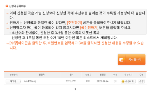 가요/방탄소년단/Am I Wrong 검색하면 이렇게 나오는데 추천하기 누르면 끝!!!