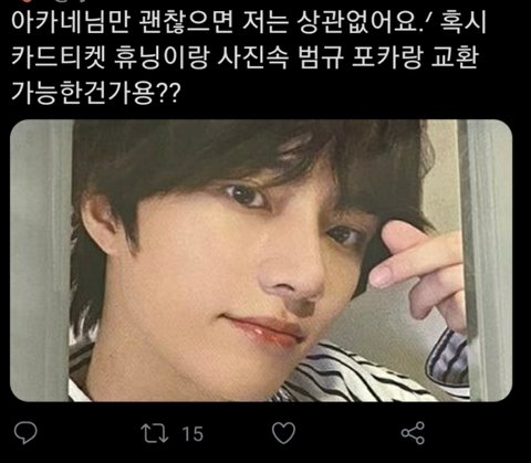 한국에서 0.6~0.7하는걸 일본에서도 6~7하는 거랑 교환하려고하넵... 솔직히 요즘 일본 모아들한테 친한척하는 거 포카 때문인 거 같아서 눈쌀 찌푸려지는 경우 꽤 있음...