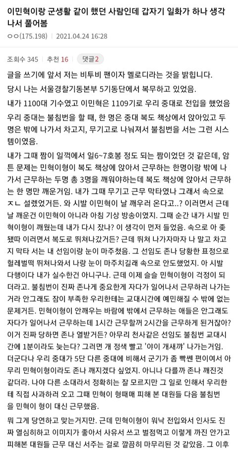 이민혁 거의 제대할때쯤 뭐 후임 생겼다 힘들었다 빡셌다 이런 말 여러번 하던데 찐이였나보네