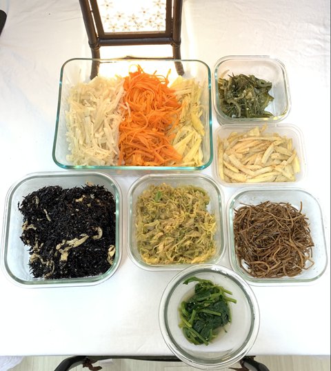 숙주나물,시금치 무침, 당근, 무, 감자, 버섯, 도라지, 미역줄기, 고구마순,양배추 볶음 외.