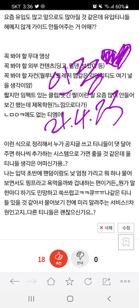 그리고 요즘 판 본문 링크가 안열려서ㅠㅠ글쓰니가 댓글 달고 그 아래 답글로도 영상 링크 달아주면 좋을 것 같애 그리고 그 댓 뭍히지 않도록 다른 티니들이 추천 눌러서 베댓 들어가면 보일 수 있게 해주고!!