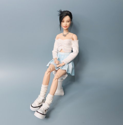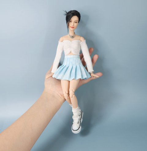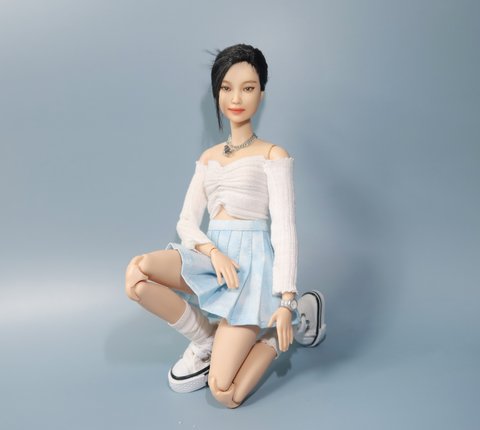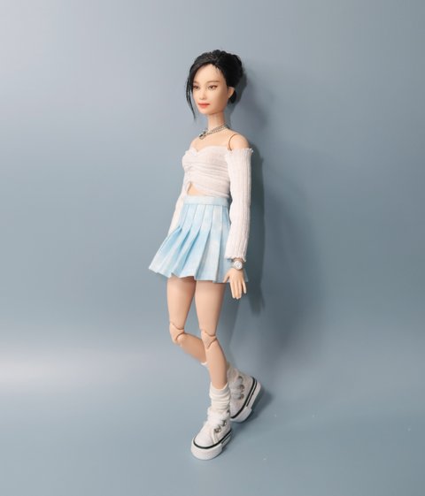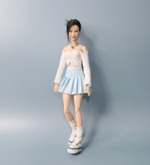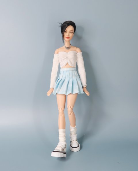 오프숄더 셔링티랑 플리츠 스커트를 입혀본 모습이에요