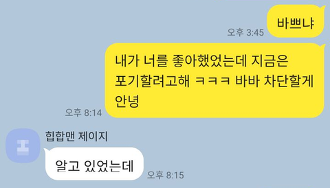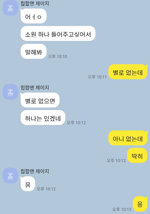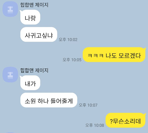 아니 내 친구 이야기인데 내가 초5때 전학을 와서 내 친구랑 만났고 완전 짱친이 됐거든. 친구도 서로밖에 없는 사이? 그런 사이였는데 우리랑 완전 안 맞는 애가 하나 있었어. 걔랑 매일 싸웠어. 아 아니다 걔가 우릴 괴롭히는 사이...? 걔가 먼저 건드리면 우리가 반응하는 그런 사이였어. 내 친구랑 걔는 같은 중학교로 올라가고 나만 따로 떨어졌어. 걔랑 친구랑 둘이 초딩때마냥 투닥투닥 싸웠대 친구말로는. 그런데 어느 날 친구가 나한테 걔를 좋아한대. 어느 순간 좋아하고 있다는 걸 깨달았다는거야. 그래서 난 걔를 별로 좋아하지는 않지만 친구를 응원해줬어. 그러다가 고등학교로 올라가면서 친구랑 걔도 떨어지게 됐어. 친구의 친구(친친)가 걔랑 연락을 하는 사이라고 해서 친구는 친친이를 통해서 걔랑 연락을 하게 됐어. 연락을 했더니 옛날에 괴롭힌 일을 사과했고 받아줬대. 평범하게 연락하는 친구사이가 되고 있었지. 그러다 친구가 걔한테 '너 좋아했는데 이제 포기하려고 바바 차단할게 안녕'이라고 보냈대. 근데 친구가 걔를 좋아하는 걸 걔가 중3때 이미 알고 있었다는거야!!!!! 걔가 친구한테 자기가 왜 좋냐고 물었대. 그래서 친구가 얘기도 하고 하는데 걔가 갑자기 귀엽다고 했대!!!!!!!!! 친구가 '내가 너 좋아한다 했을 때 기분 어땠어' 하고 던졌는데 계속 빙빙 돌렸다는거야....... 결국 친구가 노빠꾸로 나가기로 했어 '넌 어떻게 생각하는데' 던졌어요 던졌어 걔가 '나랑 사귀고 싶냐'라고 했대!!!!! 근데!!!! 친구가!!!!! 'ㅋㅋㅋ 나도 모르겠다'하...근데 걔가 '소원 하나 들어줄게' 라고 했다는거야. 근데 친구가 ? 뭔소리임 이런거임... 걔가 소원 하나 들어주고 싶다면서 다시 물었대!!! 근데!!!!!!! 친구가!!!!!!!! 또!!!!!!'별로 없는데'미치겠어 진짜 나 이거 보고 머리 뽀갤뻔 했거든 하....근데!!!! 또 걔가 '별로 없으면 하나는 있겠네'라고 또 한번 보낸거야!!!!! 근데 이 놈의 친구는 또 '아니 없는데. 딱히' 라고 했대... 친구는 그냥 '웬 소원...?' 이라는 생각이었대...... 그러고나서 이젠 걍 연락하고 사는 중...인줄 알았는데 친구가 뭐하냐고 물었더니 걔가 니생각이래... 거짓말이래.... 지금 진짜 미칠거같은데 내가 이상한거야..??????