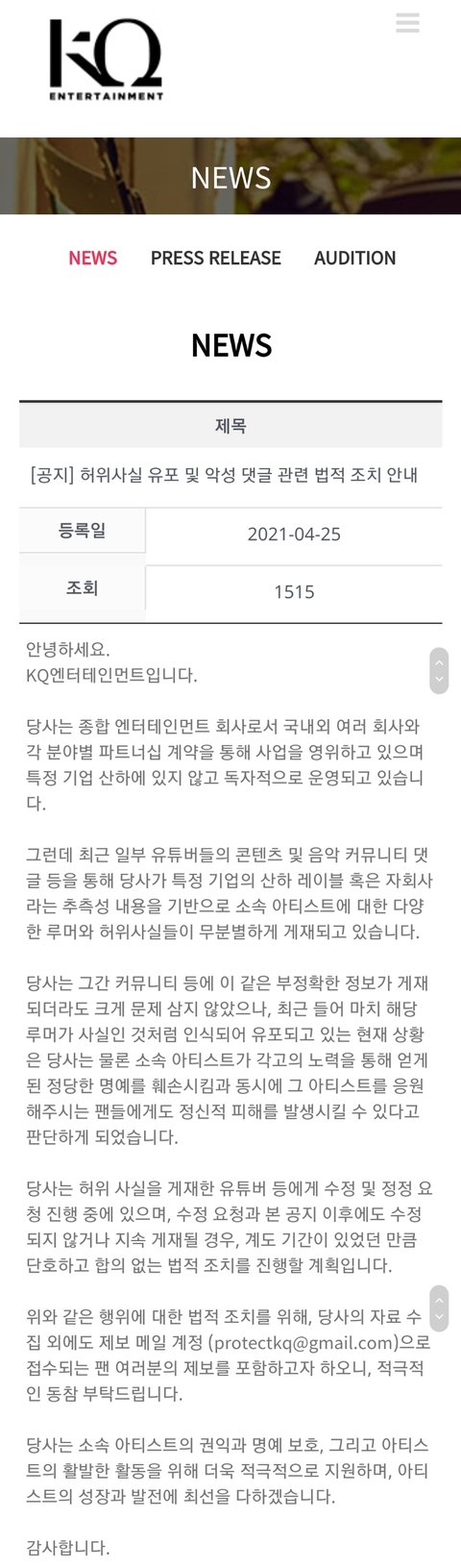 케이큐 루머 법적조치 하겠대