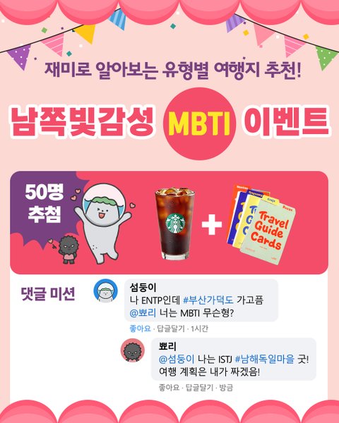응모방법 : 나의 MBTI 유형과 매칭된 추천 여행지 중 제일 좋아하는 곳을 남기고