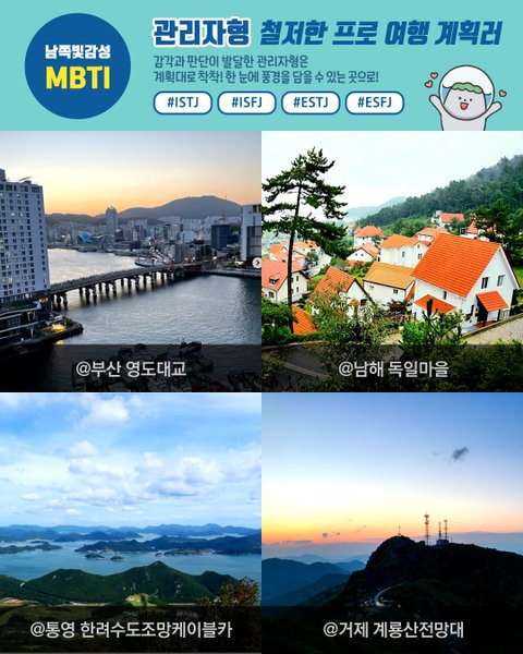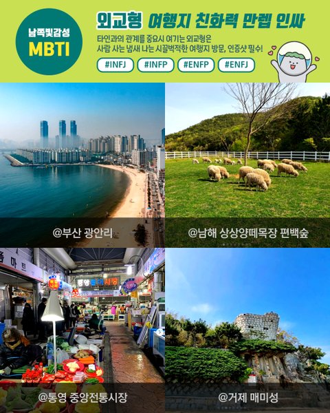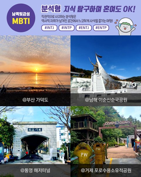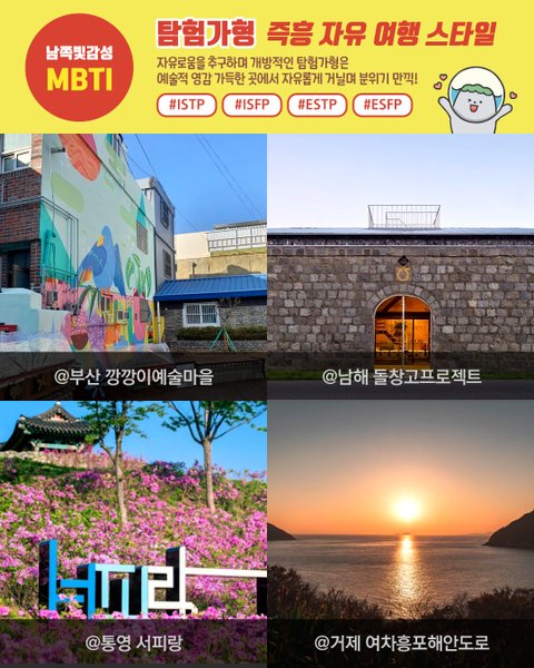 대한민국 테마여행 10선 4권역 남쪽빛감성여행에서 재미로 알아보는 MBTI 유형별 여행지를 정리해보았어요!