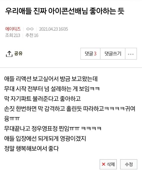 진짜 평소에도 질문 거의 안하고 스케줄, 메이크업, 음식메뉴 등등에 불평불만도, 질문도 없어서 아이콘 매니저들이 젤좋아함