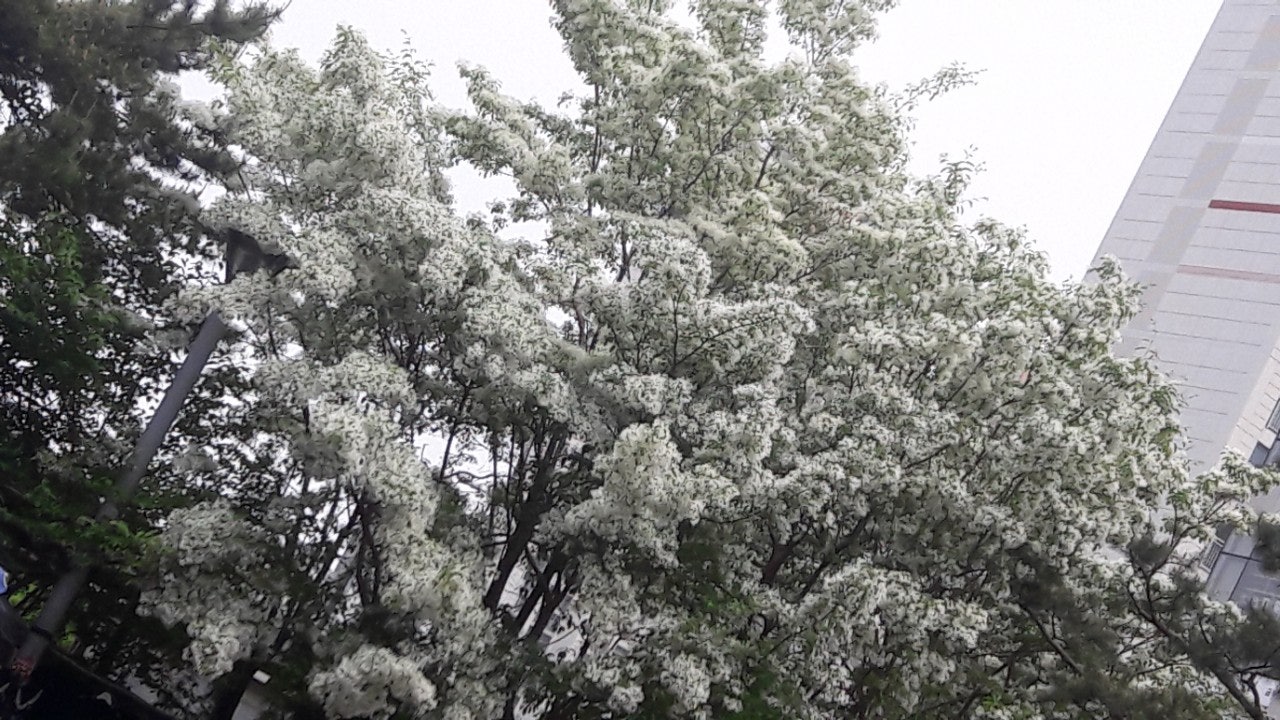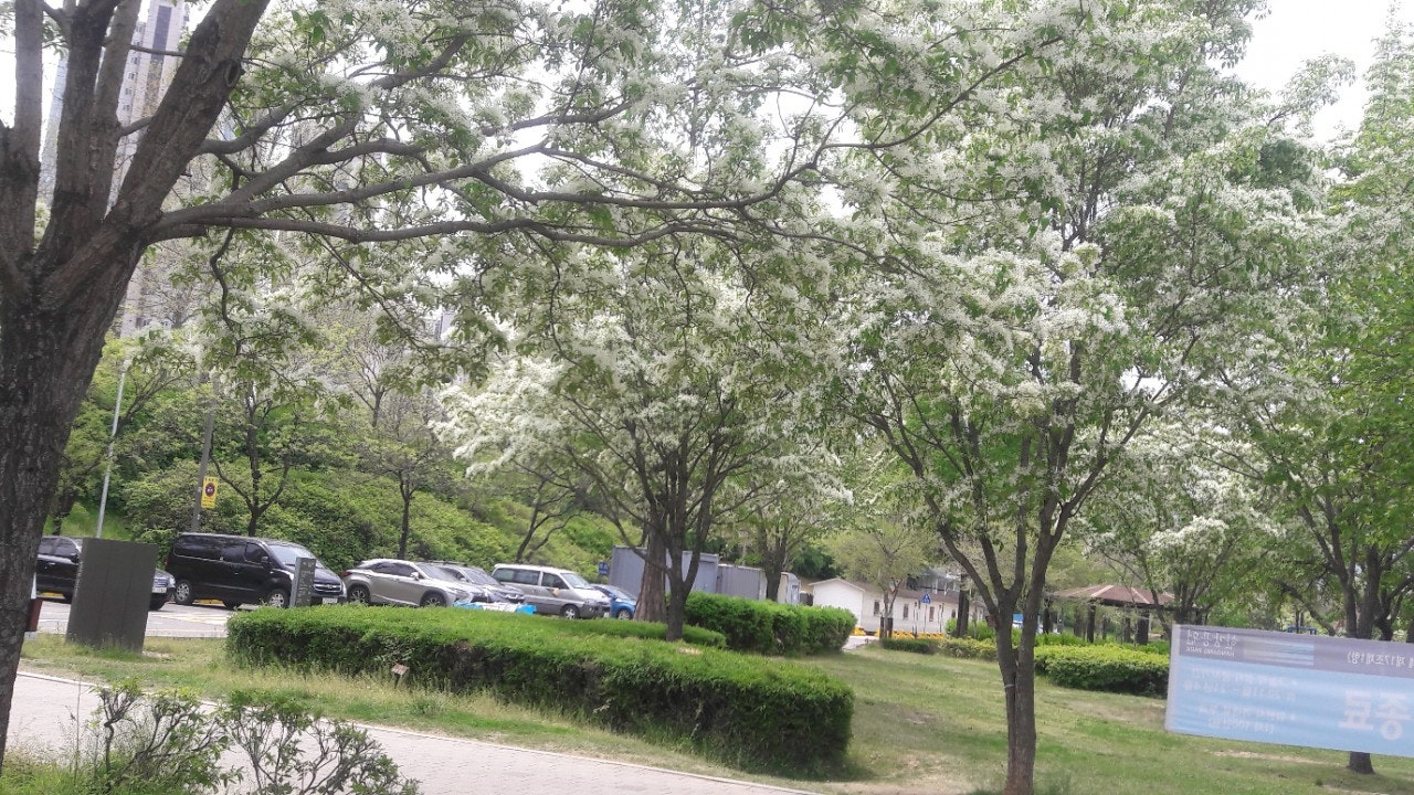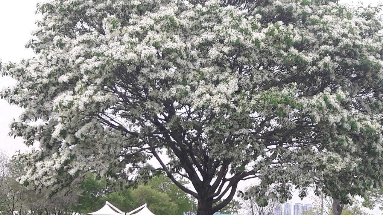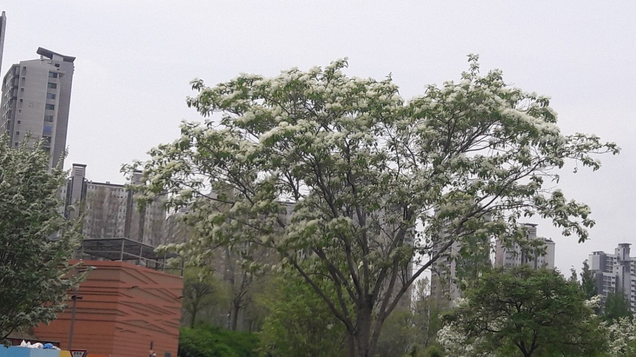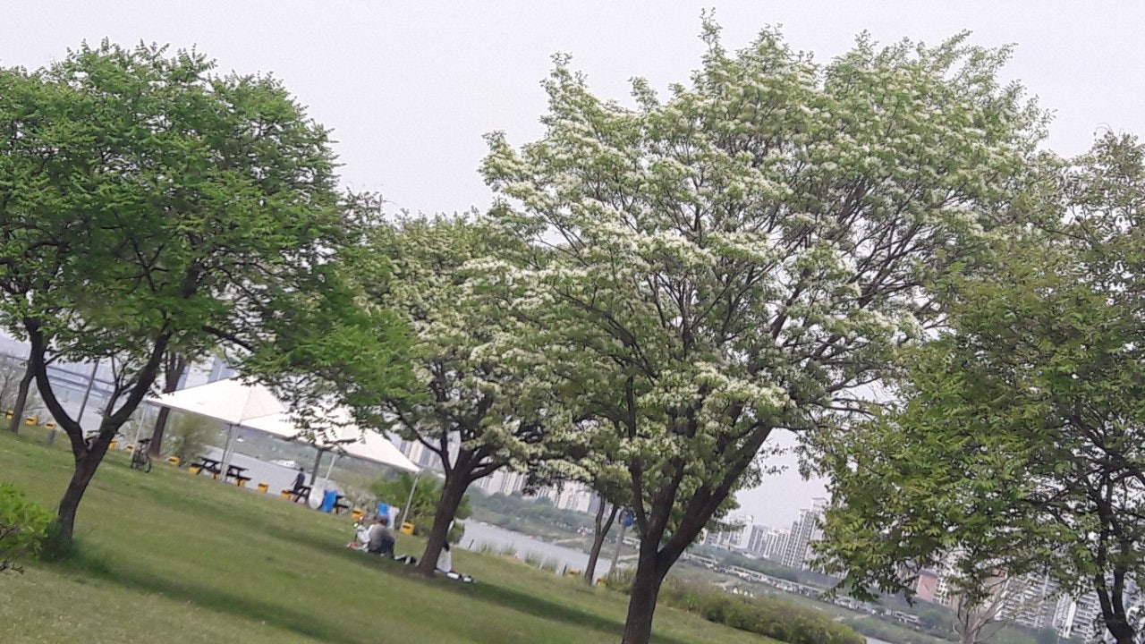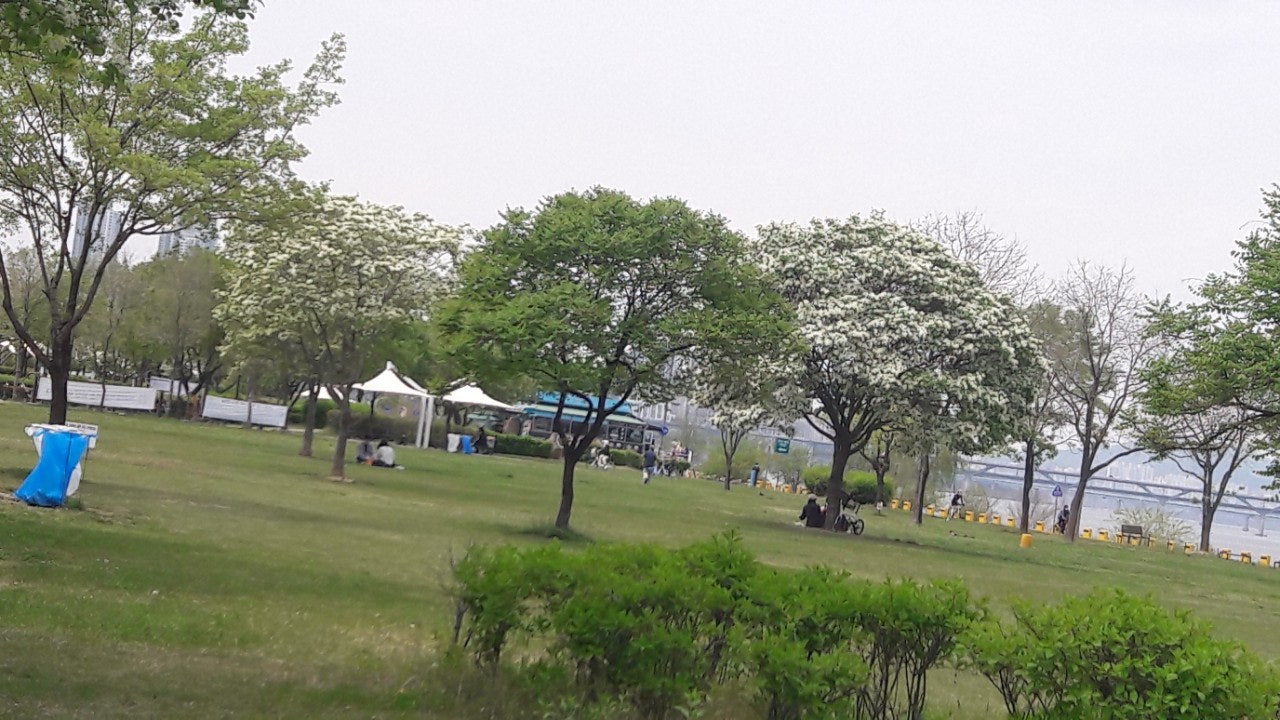 한강 공원 수양버들 조팔나무꽃