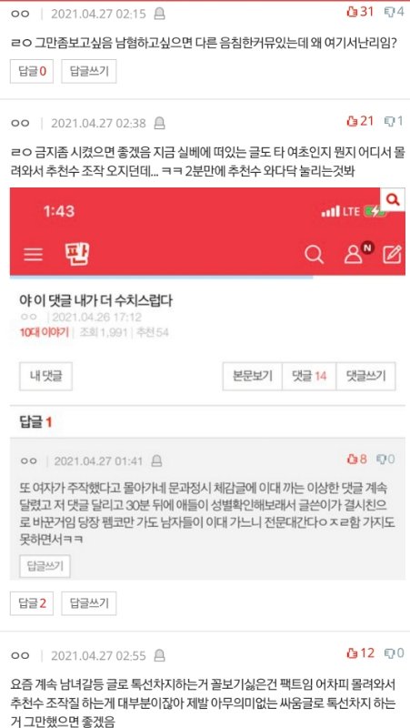 최근 톡선 군대관련 글 모두 댓글에서 페미 욕하고 있고(되게 밑도끝도없이 군대 비하해놓고 댓글로 이래서 페미는 정신병이다 이러잖아), 남녀갈등 조장글 여초에서 몰려와서 판 여론인척 주작질한다는 내용이 계속 올라와서 하는 말이야
