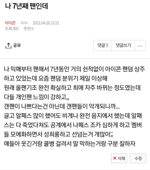 특히 써방 안하고 애들 이름 그대로 쓰고 아무말이나 막하는데 그거 좀 자제해야되잖아