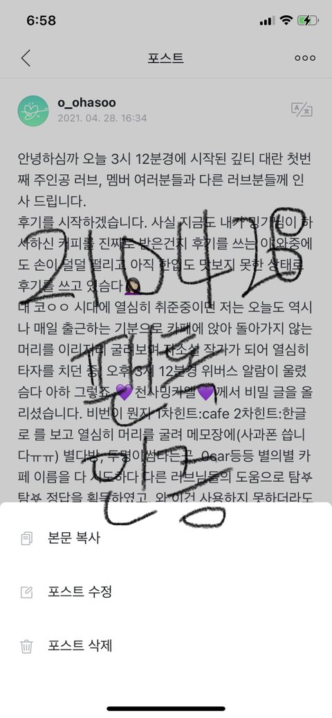 처음엔 쩨아리가 어제 밍기가 쓴 글에 뒷북댓글 단거 그거로 혼자 카페에서 낄낄거리다가 (코시국 제일 좋은거 혼자 흐뭇해 해도 마스크땜에 안보임 ^__^) 갑자기 민기가 비밀글 올린거야 3시 12분에 근데 힌트를 봐도 도저히 모르겠는거지;;(아직까지 백수인 이유 여기서 나온다 하) 그래서 결국 나빼고 다 천재인 다른 럽들 댓글보고 들어갔거든? 근데 깊티인거야;;; 와 대미친 여러분 내가수는 팬들 커피도 사줍니다ㅠㅠ 그래서 와 어짜피 이미 백명넘게본거 간직이라도 하자 싶어서 캡쳐하자마자 (이때가 3시15분 노린거 아님 ㄹㅇ 아님 걍 난 늉이랑 운명이다 싶었음;;) 밍ㄱㅣ 글삭했다고 떠서 와씨 캡쳐하길 다행이다 하고 옆동네 친구한테 자랑했거든?? 근데 그 친구가 얼른 가서 쓰라는겨 그래서 난 그래찌