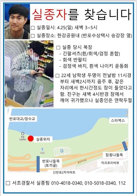 28일 서울 서초경찰서에 따르면 서울의 한 대학 재학생 A(21·남)씨는 지난 25일 오전 3∼5시께 반포한강공원 수상택시 승강장 인근에서 마지막으로 목격된 후 연락이 끊겼다.