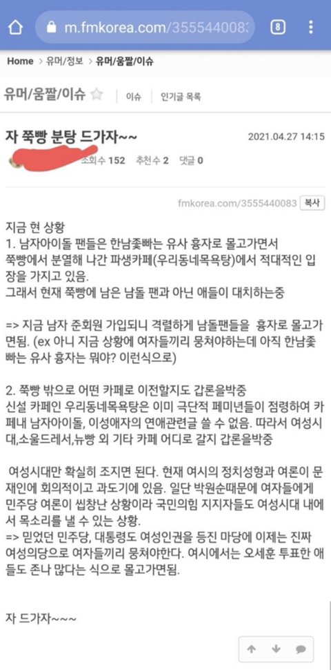4/27일 새벽에 시작된 ㅉㅃ카페의 여자 지우기를 공론화 하기 위해 글을 씁니다.