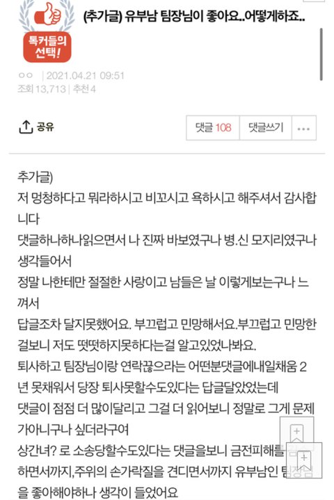 와 ㅋㅋㅋ 15년전 직장 선배노ㅁ이 나한테 고백하면서 와이프랑은 술먹고 하룻밤 실수였고 임신이 되어 어쩔수 없이 결혼했다며 사랑하는 마음 1도 없어서 그때가 처음이자 마지막 잠자리였다길래, 그럼 지금 뱃속에있는 둘째는 뭐에요? 하니 뭐? 다른남자 애라고?? ㅋㅋㅋㅋㅋㅋㅋㅋ 진짜 그집 와이프가 너무 불쌍하드라.. 난 상종도 안하고 유부남선배가 나한테 찝쩍거린다고 소문내버림, 다행히 난 그 선배한테 항상 선긋고 대한걸 다들알아서 그 선배가 퇴사함.. 저런 말도 안되는 말에 넘어가서 잠자리까지했다고? 미친 ㅋㅋㅋㅋ