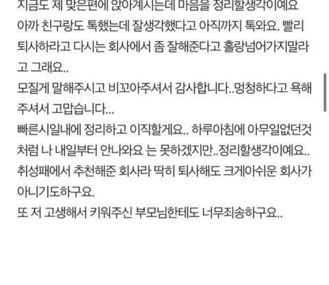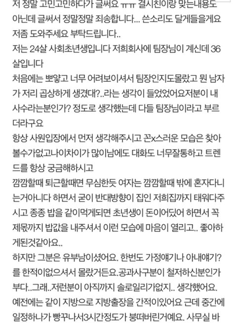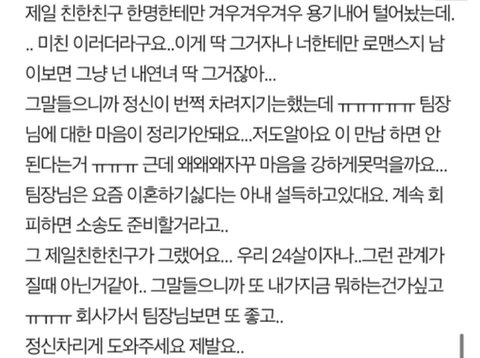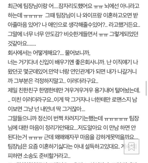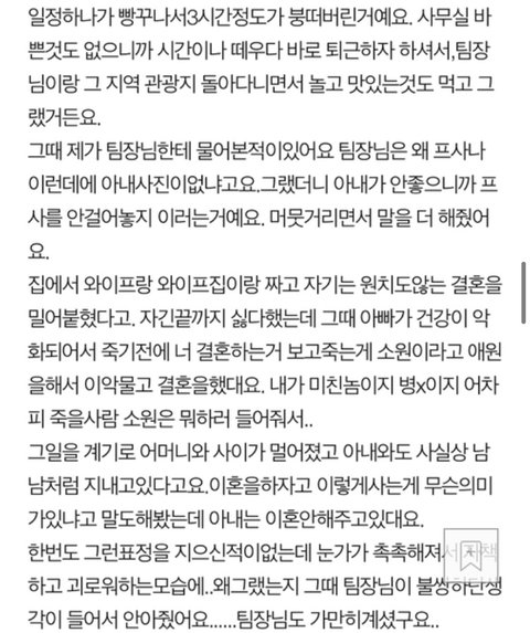 제대로 된 성인이라면 진짜 가정사가 저렇더라도 회사동료한테 저런 얘길 한다? 그것도 회사 후배? 그것도 여자 후배한테? 그것만으로 이미 수작질임.