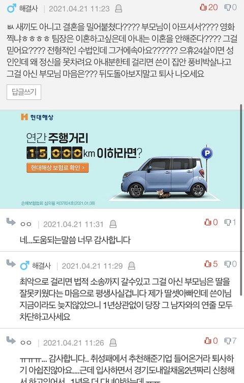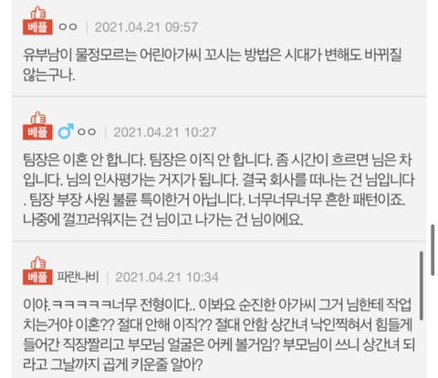바람피는 인간들 어찌 저리 레파토리가 똑같을까? ㅋㅋ 울마누라 자궁수술해서 자궁들어냈다 이 맨트는 80년대 맨트고 정략 결혼해서 정이 없다 90년대 맨트 임종을 앞에 둔 부모님의 소원 맨트는 80년대 90년대 2천년대도 변하지 않고 쓰이는거 보니 제일 잘먹히는 맨트인가 보다 아가씨 한창 이쁠 나이에 이쁜 사랑을 해도 부족한 인생입니다 유부남과 얽히는 순간 상간녀 되는건 한순간이고 인생이 똥통에 빠집니다 아직은 사람들이 아가씨를 향해 훈수도 두고 충고하는 연민이라도 가지지만 여기서 더 나가면 상간녀라는 공공의 적이 되고 아가씨 인생꼬리표처럼 따라 다닐겁니다 또래들 만나 건강한 사랑을 하세요 유부남의 달콤한 혓바닥을 믿지말고 모든 유부남의 로망이 가정은 지키되 미혼 아가씨와 설레이는 연애를 하는겁니다 그기 희생자가 되지 말길 바라는 마지막 조언입니다