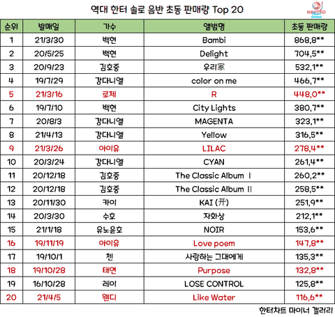 역대 솔로 음반 초동판매량 Top20